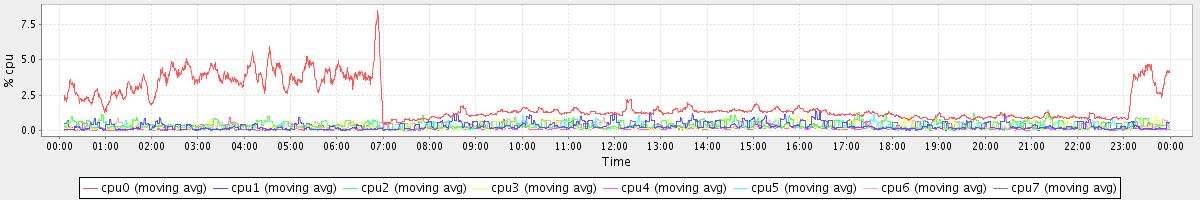 avg(cpu0) = 1.95 avg(cpu1) = 0.30 avg(cpu2) = 0.38 avg(cpu3) = 0.22 avg(cpu4) = 0.13 avg(cpu5) = 0.21 avg(cpu6) = 0.26 avg(cpu7) = 0.17