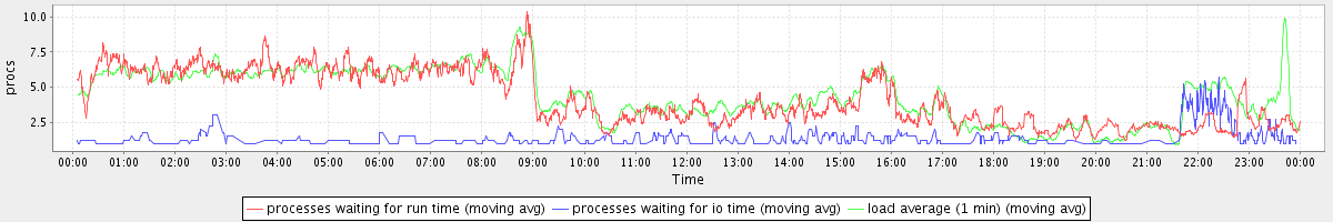 avg(processes waiting for run time) = 3.86 avg(processes waiting for io time) = 0.52 avg(load average (1 min)) = 4.42