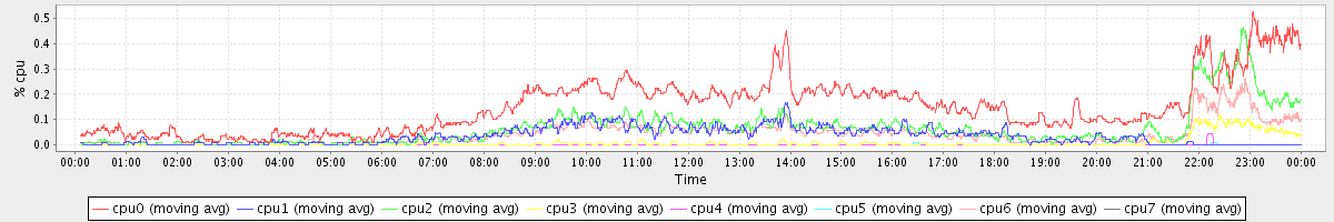avg(cpu0) = 1.55 avg(cpu1) = 0.26 avg(cpu2) = 0.30 avg(cpu3) = 0.20 avg(cpu4) = 0.19 avg(cpu5) = 0.17 avg(cpu6) = 0.24 avg(cpu7) = 0.17