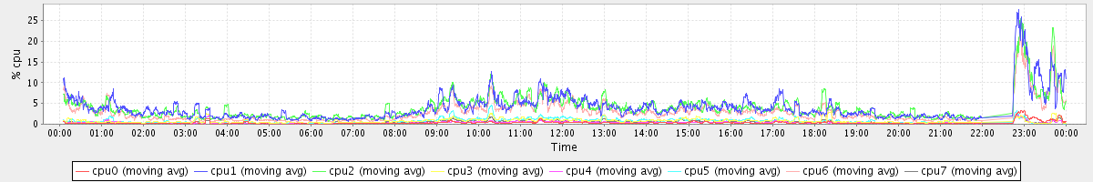 avg(cpu0) = 0.75 avg(cpu1) = 1.24 avg(cpu2) = 1.25 avg(cpu3) = 1.06 avg(cpu4) = 0.80 avg(cpu5) = 1.06 avg(cpu6) = 1.15 avg(cpu7) = 1.02