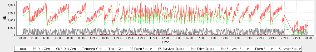 avg(total) = 2855.18 avg(PS Old Gen) = 0.00 avg(CMS Old Gen) = 2275.63 avg(Tenured Gen) = 0.00 avg(Train Gen) = 0.00 avg(PS Eden Space) = 0.00 avg(PS Survivor Space) = 0.00 avg(Par Eden Space) = 487.17 avg(Par Survivor Space) = 92.38 avg(Eden Space) = 0.00 avg(Survivor Space) = 0.00