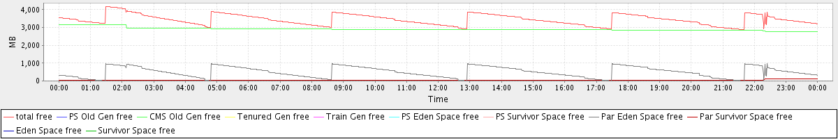 avg(total free) = 3439.87 avg(PS Old Gen free) = 0.00 avg(CMS Old Gen free) = 2905.51 avg(Tenured Gen free) = 0.00 avg(Train Gen free) = 0.00 avg(PS Eden Space free) = 0.00 avg(PS Survivor Space free) = 0.00 avg(Par Eden Space free) = 497.55 avg(Par Survivor Space free) = 36.80 avg(Eden Space free) = 0.00 avg(Survivor Space free) = 0.00