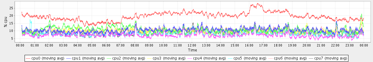 avg(cpu0) = 19.65 avg(cpu1) = 10.44 avg(cpu2) = 10.72 avg(cpu3) = 10.22 avg(cpu4) = 7.21 avg(cpu5) = 8.31 avg(cpu6) = 9.80 avg(cpu7) = 8.53