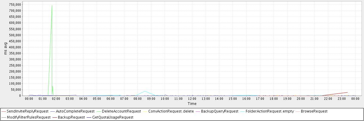 avg(SendInviteReplyRequest) = 256.20 avg(AutoCompleteRequest) = 631.97 avg(DeleteAccountRequest) = 169512.80 avg(ConvActionRequest.delete) = 441.69 avg(BackupQueryRequest) = 283.25 avg(FolderActionRequest.empty) = 2255.69 avg(BrowseRequest) = 1572.00 avg(ModifyFilterRulesRequest) = 406.00 avg(BackupRequest) = 14600.50 avg(GetQuotaUsageRequest) = 1239.00