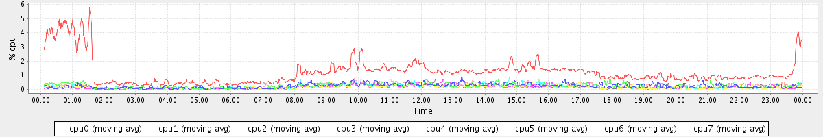 avg(cpu0) = 1.22 avg(cpu1) = 0.24 avg(cpu2) = 0.24 avg(cpu3) = 0.15 avg(cpu4) = 0.15 avg(cpu5) = 0.16 avg(cpu6) = 0.20 avg(cpu7) = 0.15