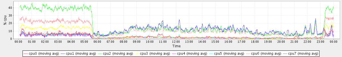 avg(cpu0) = 3.32 avg(cpu1) = 9.59 avg(cpu2) = 17.40 avg(cpu3) = 4.81 avg(cpu4) = 1.94 avg(cpu5) = 2.29 avg(cpu6) = 12.11 avg(cpu7) = 2.29
