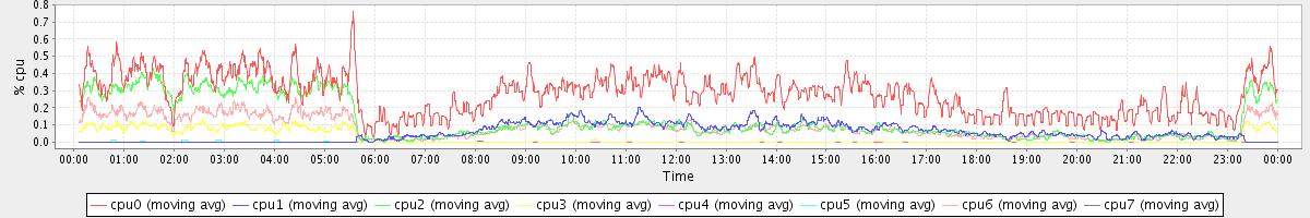 avg(cpu0) = 0.28 avg(cpu1) = 0.05 avg(cpu2) = 0.13 avg(cpu3) = 0.02 avg(cpu4) = 0.00 avg(cpu5) = 0.00 avg(cpu6) = 0.08 avg(cpu7) = 0.00