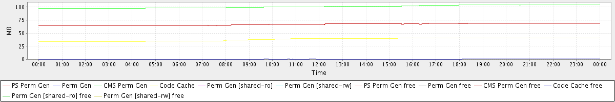 avg(PS Perm Gen) = 0.00 avg(Perm Gen) = 0.00 avg(CMS Perm Gen) = 100.95 avg(Code Cache) = 38.36 avg(Perm Gen [shared-ro]) = 0.00 avg(Perm Gen [shared-rw]) = 0.00 avg(PS Perm Gen free) = 0.00 avg(Perm Gen free) = 0.00 avg(CMS Perm Gen free) = 67.29 avg(Code Cache free) = 0.41 avg(Perm Gen [shared-ro] free) = 0.00 avg(Perm Gen [shared-rw] free) = 0.00