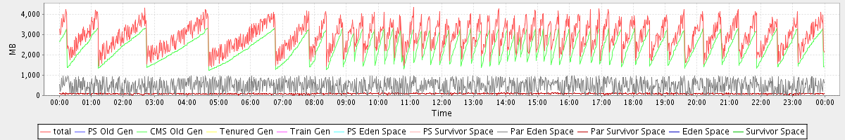 avg(total) = 2925.24 avg(PS Old Gen) = 0.00 avg(CMS Old Gen) = 2348.76 avg(Tenured Gen) = 0.00 avg(Train Gen) = 0.00 avg(PS Eden Space) = 0.00 avg(PS Survivor Space) = 0.00 avg(Par Eden Space) = 487.68 avg(Par Survivor Space) = 88.81 avg(Eden Space) = 0.00 avg(Survivor Space) = 0.00