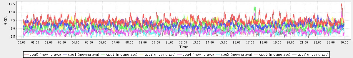 avg(cpu0) = 7.22 avg(cpu1) = 6.14 avg(cpu2) = 5.96 avg(cpu3) = 6.24 avg(cpu4) = 4.17 avg(cpu5) = 4.13 avg(cpu6) = 4.44 avg(cpu7) = 4.25