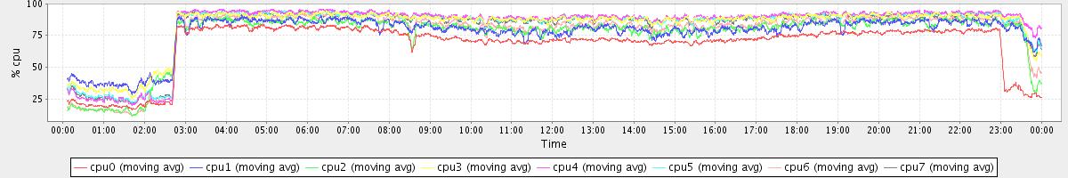 avg(cpu0) = 67.38 avg(cpu1) = 77.15 avg(cpu2) = 75.39 avg(cpu3) = 82.90 avg(cpu4) = 83.60 avg(cpu5) = 82.57 avg(cpu6) = 77.57 avg(cpu7) = 81.85