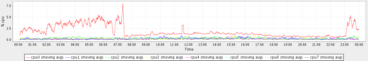 avg(cpu0) = 1.86 avg(cpu1) = 0.23 avg(cpu2) = 0.32 avg(cpu3) = 0.17 avg(cpu4) = 0.13 avg(cpu5) = 0.15 avg(cpu6) = 0.23 avg(cpu7) = 0.12