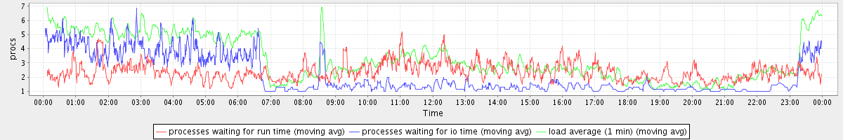 avg(processes waiting for run time) = 1.75 avg(processes waiting for io time) = 1.47 avg(load average (1 min)) = 3.29