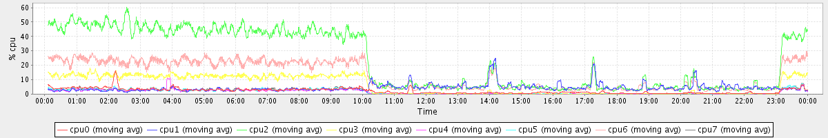 avg(cpu0) = 19.42 avg(cpu1) = 9.60 avg(cpu2) = 10.44 avg(cpu3) = 9.31 avg(cpu4) = 6.86 avg(cpu5) = 8.64 avg(cpu6) = 9.57 avg(cpu7) = 8.34