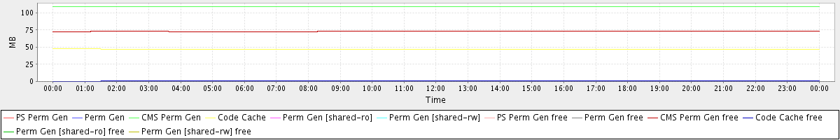 avg(PS Perm Gen) = 0.00 avg(Perm Gen) = 0.00 avg(CMS Perm Gen) = 109.17 avg(Code Cache) = 47.24 avg(Perm Gen [shared-ro]) = 0.00 avg(Perm Gen [shared-rw]) = 0.00 avg(PS Perm Gen free) = 0.00 avg(Perm Gen free) = 0.00 avg(CMS Perm Gen free) = 72.94 avg(Code Cache free) = 0.70 avg(Perm Gen [shared-ro] free) = 0.00 avg(Perm Gen [shared-rw] free) = 0.00
