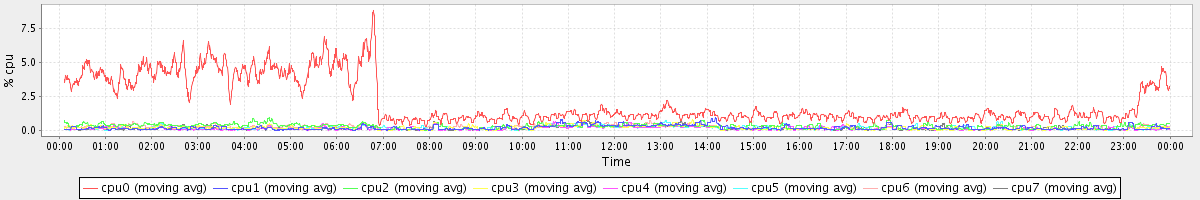 avg(cpu0) = 2.07 avg(cpu1) = 0.19 avg(cpu2) = 0.30 avg(cpu3) = 0.19 avg(cpu4) = 0.13 avg(cpu5) = 0.16 avg(cpu6) = 0.22 avg(cpu7) = 0.15