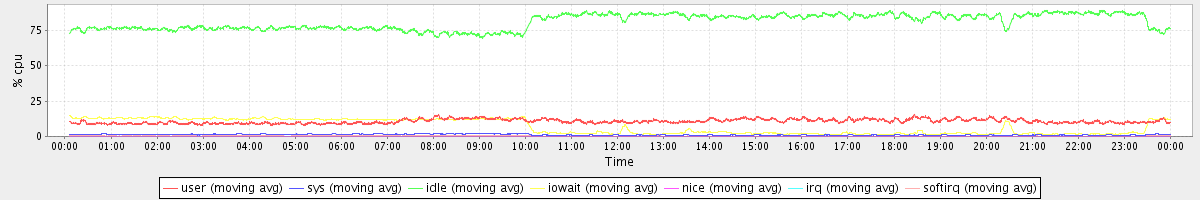 avg(user) = 10.67 avg(sys) = 1.20 avg(idle) = 80.97 avg(iowait) = 6.78 avg(nice) = 0.00 avg(irq) = 0.04 avg(softirq) = 0.34