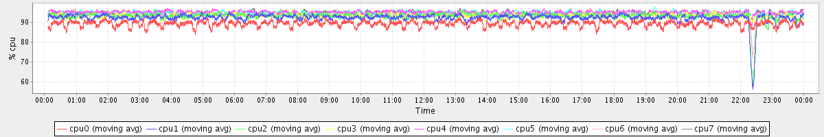 avg(cpu0) = 89.25 avg(cpu1) = 92.27 avg(cpu2) = 92.99 avg(cpu3) = 93.22 avg(cpu4) = 94.92 avg(cpu5) = 94.58 avg(cpu6) = 94.44 avg(cpu7) = 94.54