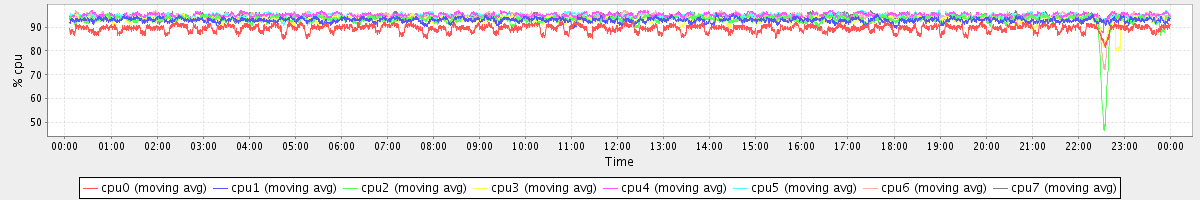 avg(cpu0) = 89.47 avg(cpu1) = 92.92 avg(cpu2) = 93.00 avg(cpu3) = 92.98 avg(cpu4) = 94.96 avg(cpu5) = 94.66 avg(cpu6) = 94.45 avg(cpu7) = 94.44