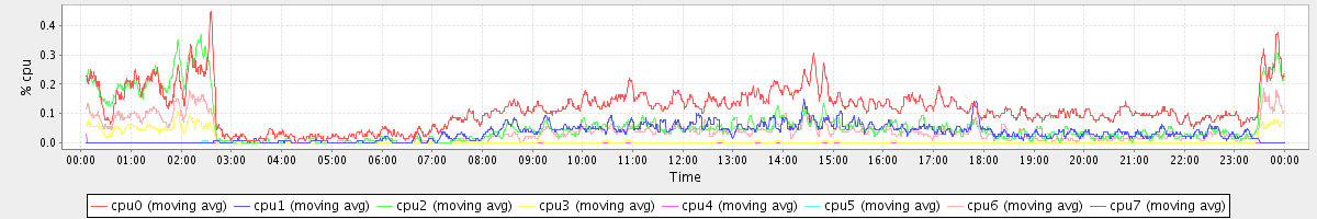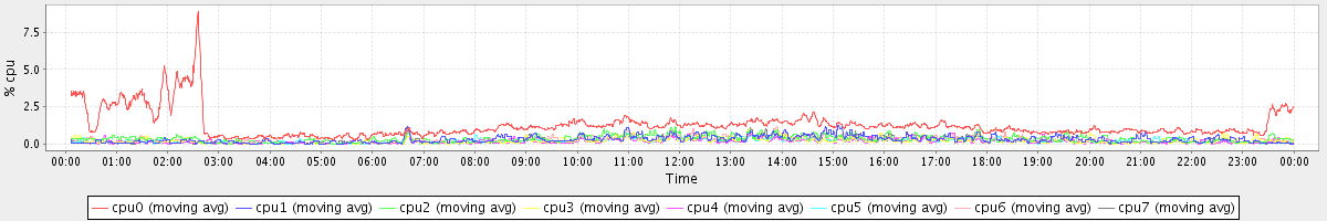 avg(cpu0) = 1.27 avg(cpu1) = 0.31 avg(cpu2) = 0.34 avg(cpu3) = 0.22 avg(cpu4) = 0.17 avg(cpu5) = 0.19 avg(cpu6) = 0.26 avg(cpu7) = 0.20
