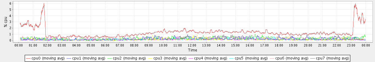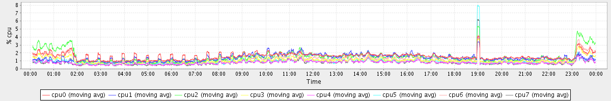 avg(cpu0) = 1.31 avg(cpu1) = 0.26 avg(cpu2) = 0.29 avg(cpu3) = 0.18 avg(cpu4) = 0.13 avg(cpu5) = 0.17 avg(cpu6) = 0.21 avg(cpu7) = 0.15