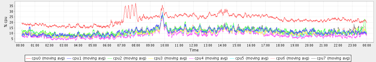 avg(cpu0) = 1.06 avg(cpu1) = 0.25 avg(cpu2) = 0.27 avg(cpu3) = 0.18 avg(cpu4) = 0.14 avg(cpu5) = 0.15 avg(cpu6) = 0.19 avg(cpu7) = 0.15