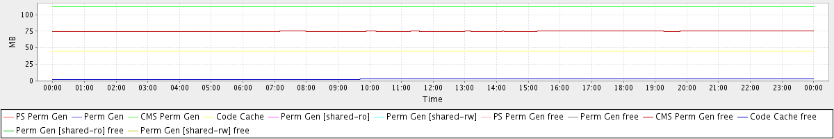 avg(PS Perm Gen) = 0.00 avg(Perm Gen) = 0.00 avg(CMS Perm Gen) = 112.17 avg(Code Cache) = 45.22 avg(Perm Gen [shared-ro]) = 0.00 avg(Perm Gen [shared-rw]) = 0.00 avg(PS Perm Gen free) = 0.00 avg(Perm Gen free) = 0.00 avg(CMS Perm Gen free) = 74.89 avg(Code Cache free) = 2.65 avg(Perm Gen [shared-ro] free) = 0.00 avg(Perm Gen [shared-rw] free) = 0.00