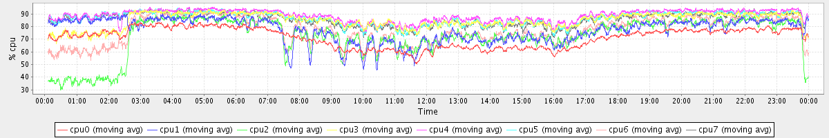 avg(cpu0) = 71.20 avg(cpu1) = 77.09 avg(cpu2) = 72.23 avg(cpu3) = 84.86 avg(cpu4) = 88.69 avg(cpu5) = 86.64 avg(cpu6) = 77.29 avg(cpu7) = 85.86