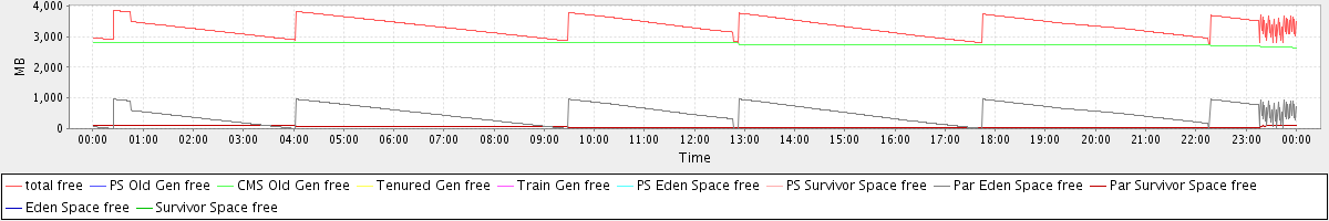 avg(total free) = 3328.58 avg(PS Old Gen free) = 0.00 avg(CMS Old Gen free) = 2768.91 avg(Tenured Gen free) = 0.00 avg(Train Gen free) = 0.00 avg(PS Eden Space free) = 0.00 avg(PS Survivor Space free) = 0.00 avg(Par Eden Space free) = 504.78 avg(Par Survivor Space free) = 54.88 avg(Eden Space free) = 0.00 avg(Survivor Space free) = 0.00