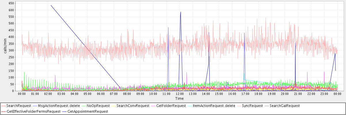 max(SearchRequest) = 75.00 max(MsgActionRequest.delete) = 470.00 max(NoOpRequest) = 138.00 max(SearchConvRequest) = 68.00 max(GetFolderRequest) = 141.00 max(ItemActionRequest.delete) = 130.00 max(SyncRequest) = 543.00 max(SearchGalRequest) = 56.00 max(GetEffectiveFolderPermsRequest) = 62.00 max(GetAppointmentRequest) = 634.00