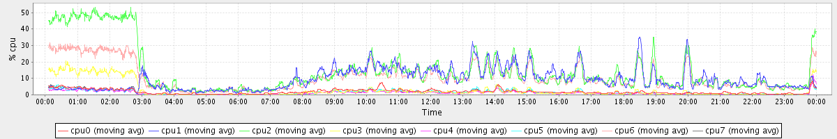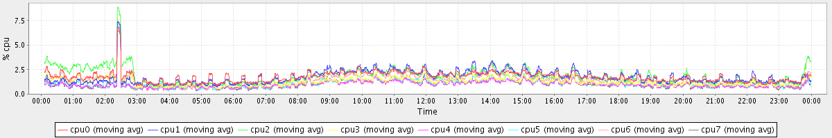 avg(cpu0) = 1.42 avg(cpu1) = 0.35 avg(cpu2) = 0.36 avg(cpu3) = 0.23 avg(cpu4) = 0.19 avg(cpu5) = 0.19 avg(cpu6) = 0.27 avg(cpu7) = 0.21