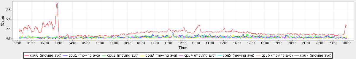 avg(cpu0) = 1.52 avg(cpu1) = 0.34 avg(cpu2) = 0.36 avg(cpu3) = 0.24 avg(cpu4) = 0.19 avg(cpu5) = 0.21 avg(cpu6) = 0.26 avg(cpu7) = 0.21