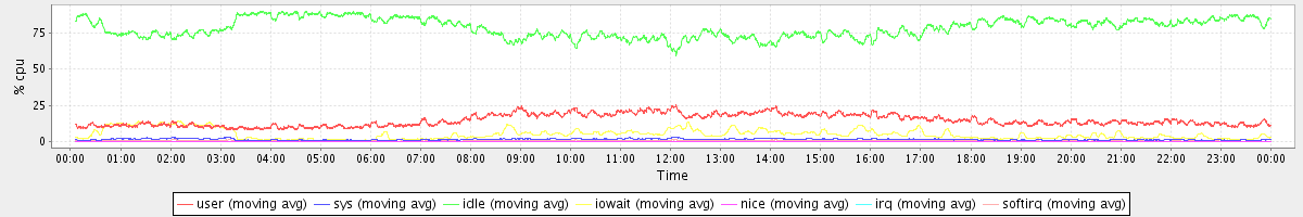avg(user) = 14.62 avg(sys) = 1.42 avg(idle) = 78.47 avg(iowait) = 4.99 avg(nice) = 0.00 avg(irq) = 0.04 avg(softirq) = 0.45