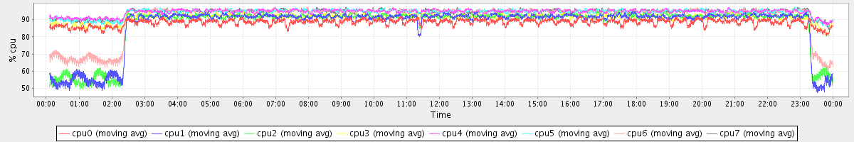 avg(cpu0) = 88.48 avg(cpu1) = 87.14 avg(cpu2) = 87.35 avg(cpu3) = 91.34 avg(cpu4) = 94.40 avg(cpu5) = 94.17 avg(cpu6) = 91.46 avg(cpu7) = 94.33