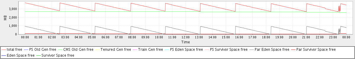 avg(total free) = 3196.46 avg(PS Old Gen free) = 0.00 avg(CMS Old Gen free) = 2649.00 avg(Tenured Gen free) = 0.00 avg(Train Gen free) = 0.00 avg(PS Eden Space free) = 0.00 avg(PS Survivor Space free) = 0.00 avg(Par Eden Space free) = 486.83 avg(Par Survivor Space free) = 60.63 avg(Eden Space free) = 0.00 avg(Survivor Space free) = 0.00