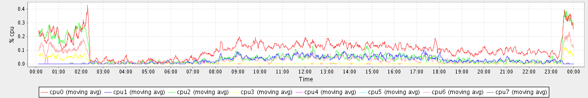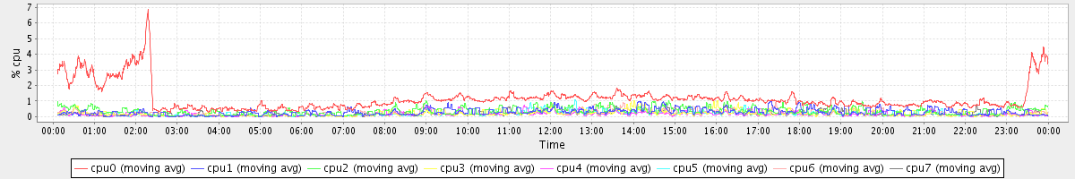 avg(cpu0) = 1.19 avg(cpu1) = 0.30 avg(cpu2) = 0.35 avg(cpu3) = 0.21 avg(cpu4) = 0.15 avg(cpu5) = 0.18 avg(cpu6) = 0.24 avg(cpu7) = 0.18