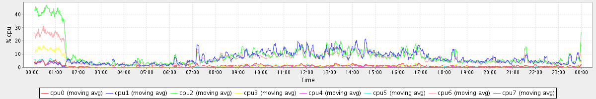 avg(cpu0) = 1.32 avg(cpu1) = 0.30 avg(cpu2) = 0.37 avg(cpu3) = 0.24 avg(cpu4) = 0.20 avg(cpu5) = 0.20 avg(cpu6) = 0.24 avg(cpu7) = 0.21