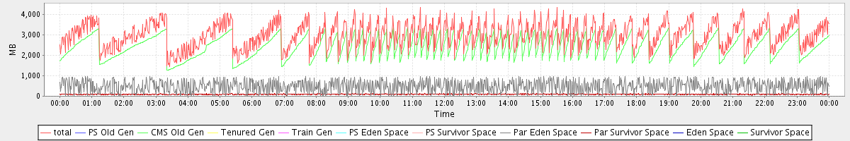 avg(total) = 3003.82 avg(PS Old Gen) = 0.00 avg(CMS Old Gen) = 2422.09 avg(Tenured Gen) = 0.00 avg(Train Gen) = 0.00 avg(PS Eden Space) = 0.00 avg(PS Survivor Space) = 0.00 avg(Par Eden Space) = 488.61 avg(Par Survivor Space) = 93.12 avg(Eden Space) = 0.00 avg(Survivor Space) = 0.00