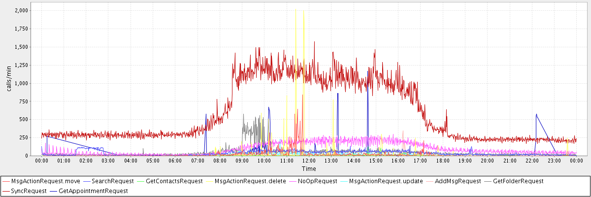 max(MsgActionRequest.move) = 838.00 max(SearchRequest) = 138.00 max(GetContactsRequest) = 122.00 max(MsgActionRequest.delete) = 2018.00 max(NoOpRequest) = 299.00 max(MsgActionRequest.update) = 230.00 max(AddMsgRequest) = 343.00 max(GetFolderRequest) = 577.00 max(SyncRequest) = 1570.00 max(GetAppointmentRequest) = 1169.00