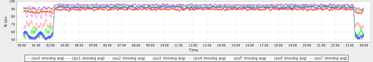avg(cpu0) = 89.23 avg(cpu1) = 87.68 avg(cpu2) = 88.36 avg(cpu3) = 91.56 avg(cpu4) = 94.27 avg(cpu5) = 94.36 avg(cpu6) = 91.55 avg(cpu7) = 94.63