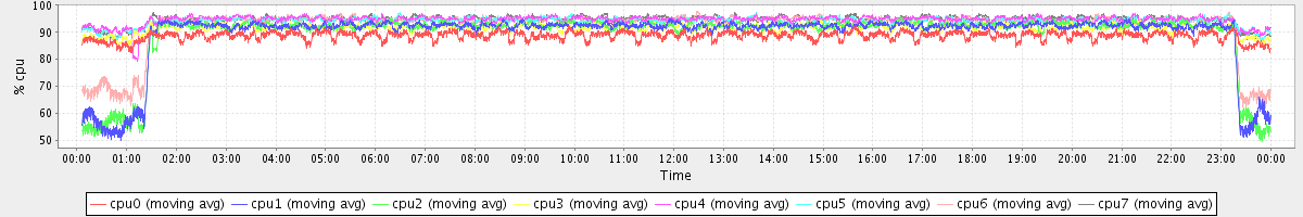 avg(cpu0) = 88.72 avg(cpu1) = 89.38 avg(cpu2) = 89.36 avg(cpu3) = 91.65 avg(cpu4) = 94.62 avg(cpu5) = 94.12 avg(cpu6) = 92.29 avg(cpu7) = 94.68