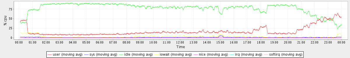 avg(user) = 17.44 avg(sys) = 1.19 avg(idle) = 77.62 avg(iowait) = 3.36 avg(nice) = 0.00 avg(irq) = 0.02 avg(softirq) = 0.36