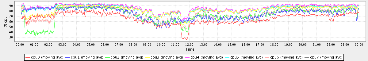 avg(cpu0) = 66.19 avg(cpu1) = 74.96 avg(cpu2) = 71.78 avg(cpu3) = 82.32 avg(cpu4) = 86.61 avg(cpu5) = 84.35 avg(cpu6) = 75.04 avg(cpu7) = 84.50