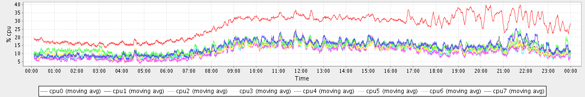 avg(cpu0) = 1.41 avg(cpu1) = 0.33 avg(cpu2) = 0.33 avg(cpu3) = 0.24 avg(cpu4) = 0.19 avg(cpu5) = 0.17 avg(cpu6) = 0.23 avg(cpu7) = 0.18