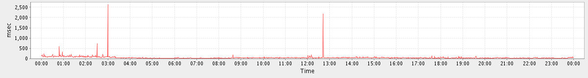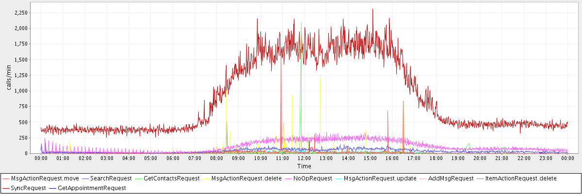 max(MsgActionRequest.move) = 1677.00 max(SearchRequest) = 155.00 max(GetContactsRequest) = 2091.00 max(MsgActionRequest.delete) = 1264.00 max(NoOpRequest) = 332.00 max(MsgActionRequest.update) = 798.00 max(AddMsgRequest) = 490.00 max(ItemActionRequest.delete) = 504.00 max(SyncRequest) = 2306.00 max(GetAppointmentRequest) = 207.00