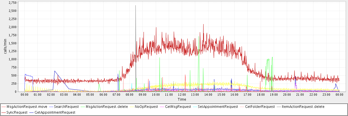 max(MsgActionRequest.move) = 530.00 max(SearchRequest) = 557.00 max(MsgActionRequest.delete) = 1712.00 max(NoOpRequest) = 326.00 max(GetMsgRequest) = 268.00 max(SetAppointmentRequest) = 259.00 max(GetFolderRequest) = 493.00 max(ItemActionRequest.delete) = 2663.00 max(SyncRequest) = 2087.00 max(GetAppointmentRequest) = 642.00