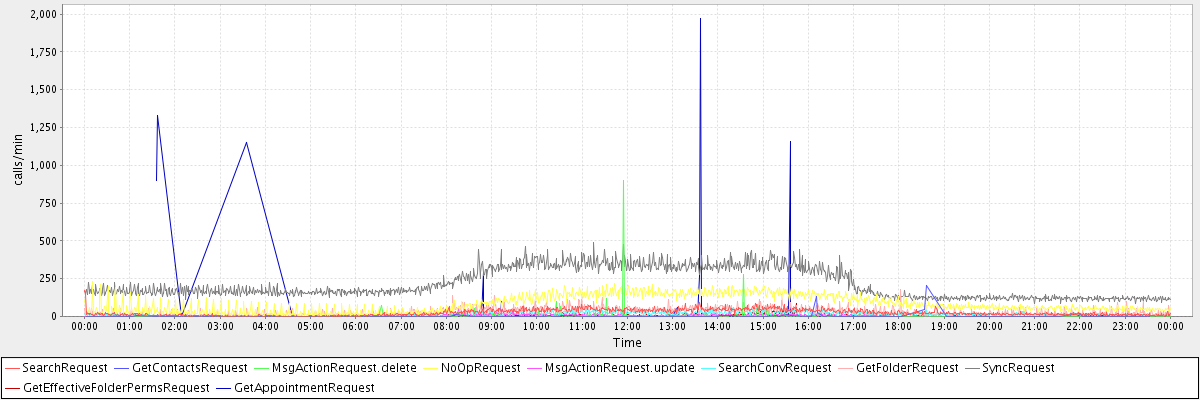 max(SearchRequest) = 169.00 max(GetContactsRequest) = 206.00 max(MsgActionRequest.delete) = 898.00 max(NoOpRequest) = 229.00 max(MsgActionRequest.update) = 55.00 max(SearchConvRequest) = 59.00 max(GetFolderRequest) = 178.00 max(SyncRequest) = 492.00 max(GetEffectiveFolderPermsRequest) = 84.00 max(GetAppointmentRequest) = 1969.00