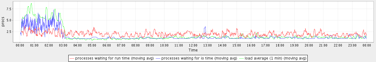 avg(processes waiting for run time) = 1.18 avg(processes waiting for io time) = 0.62 avg(load average (1 min)) = 1.76