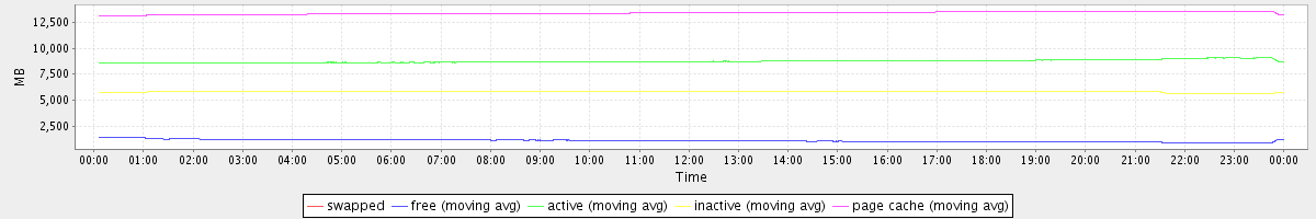 avg(swapped) = 0.00 avg(free) = 1078.59 avg(active) = 8747.46 avg(inactive) = 5805.01 avg(page cache) = 13418.25