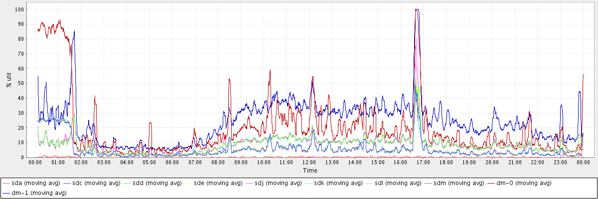 avg(sda) = 0.28 avg(sdc) = 5.73 avg(sdd) = 8.62 avg(sde) = 5.70 avg(sdj) = 8.74 avg(sdk) = 5.66 avg(sdl) = 8.66 avg(sdm) = 5.63 avg(dm-0) = 20.10 avg(dm-1) = 24.45